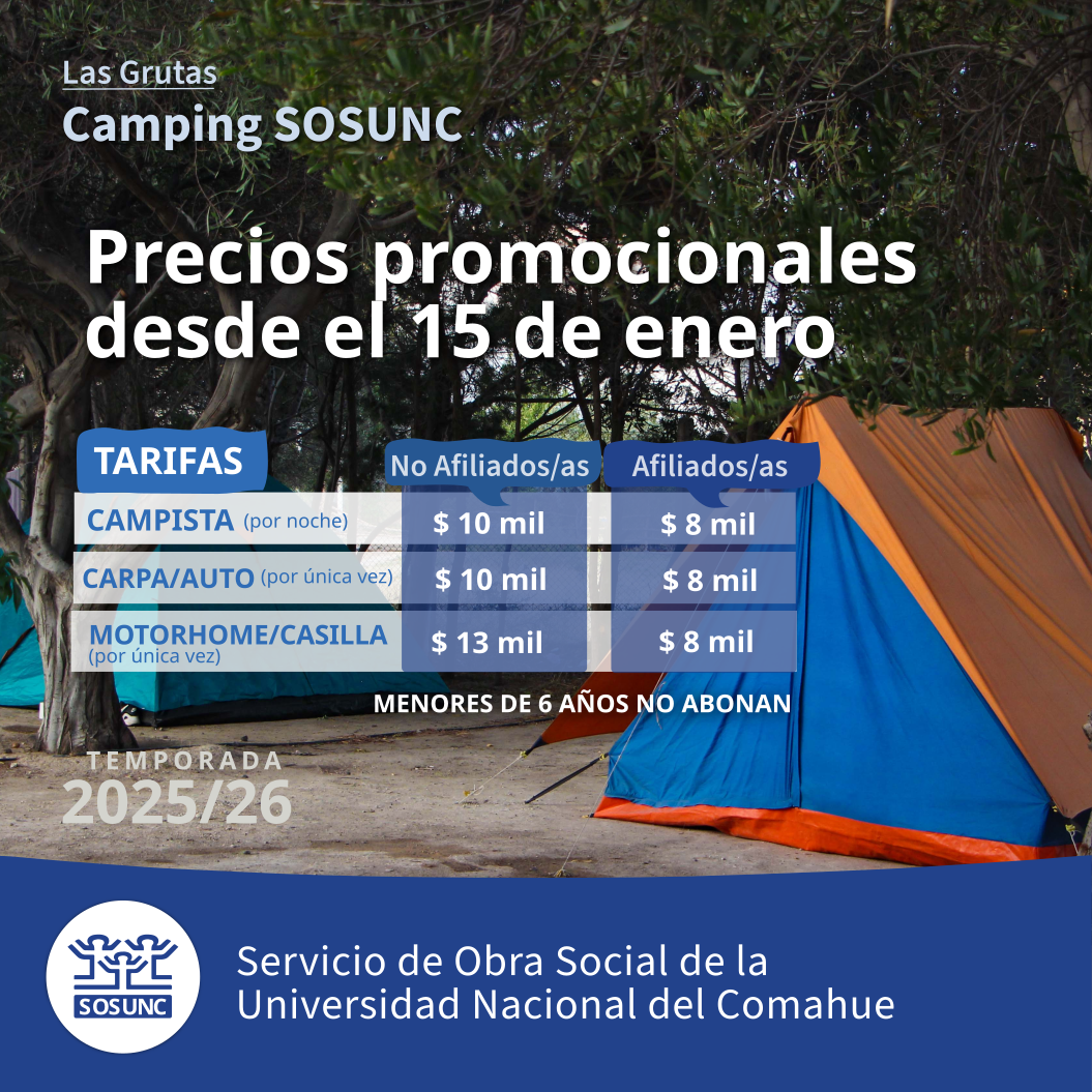 Bajamos nuestras tarifas para vos. Aprovechá nuestros precios promocionales para disfrutar de tus vacaciones familiares en el Camping SOSUNC en Las Grutas. Te ofrecemos un entorno natural con parcelas arboladas, mucha sombra y una ubicación privilegiada a pocos pasos de la playa.