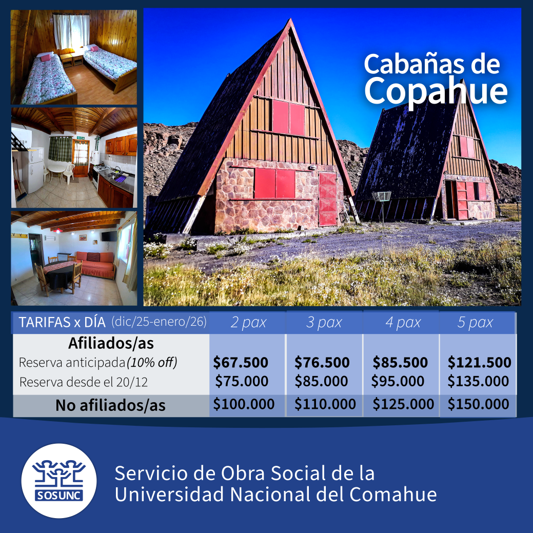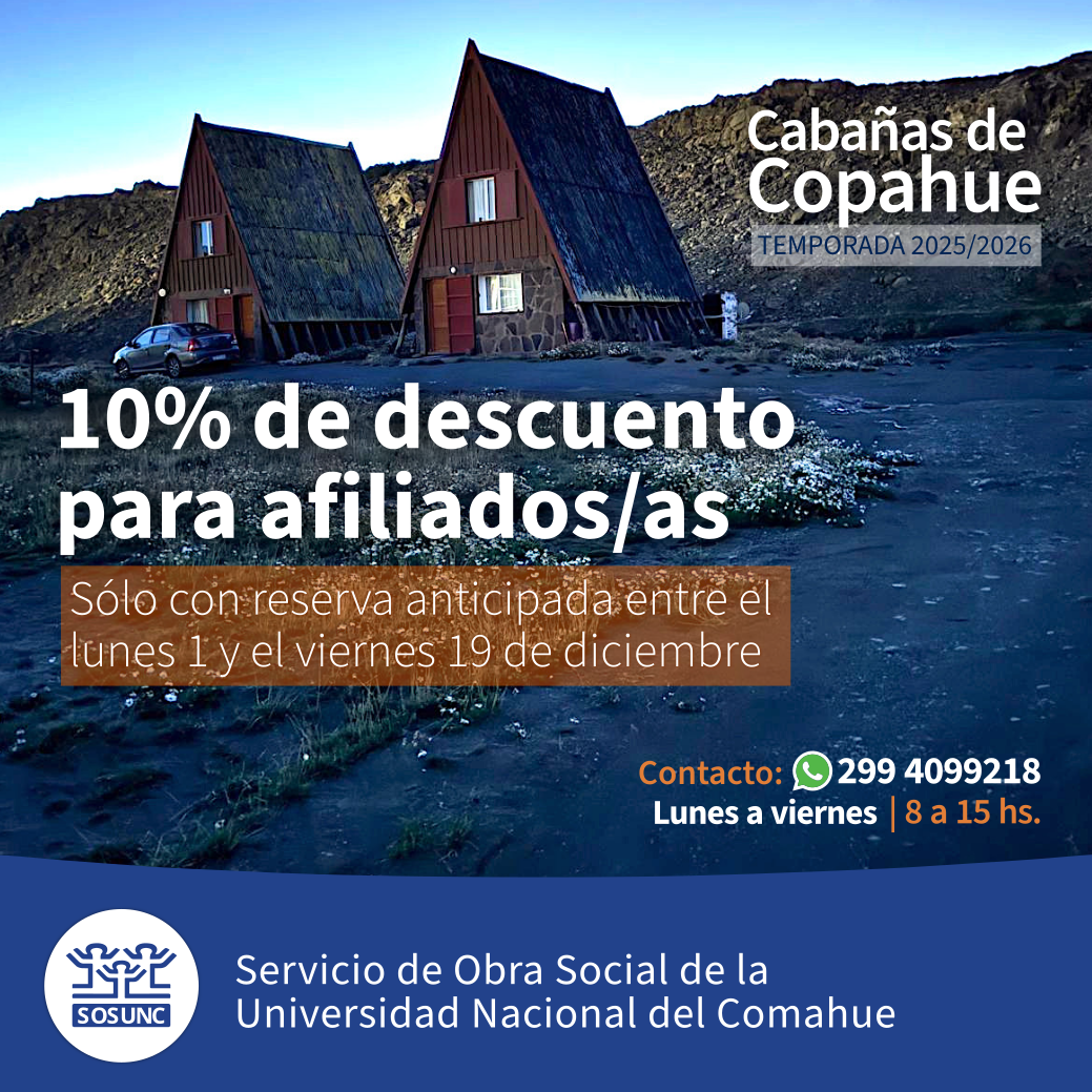 Del 1 al 19 de diciembre, SOSUNC habilita una reserva anticipada exclusiva para afiliados/as, para alojarse en las Cabañas de Copahue durante cualquier fecha de la temporada. Durante este período, las reservas contarán con un 10% de descuento sobre la tarifa vigente.