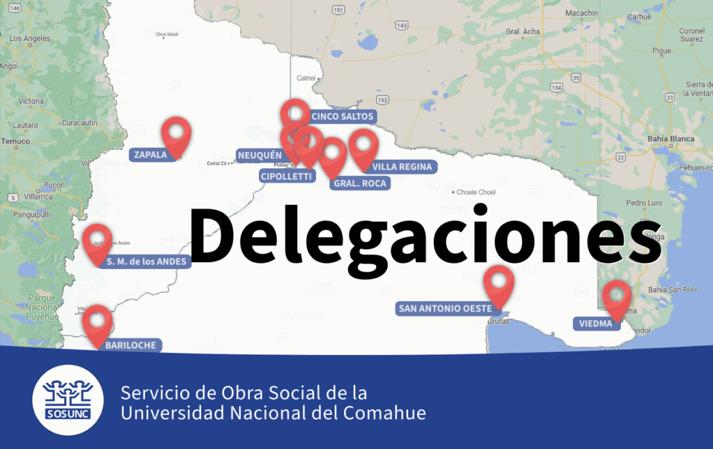SOSUNC cuenta con 10 delegaciones distribuidas en las provincias de Río Negro y Neuquén para la atención de los afiliados y afiliadas de las distintas unidades académicas de la UNCo..