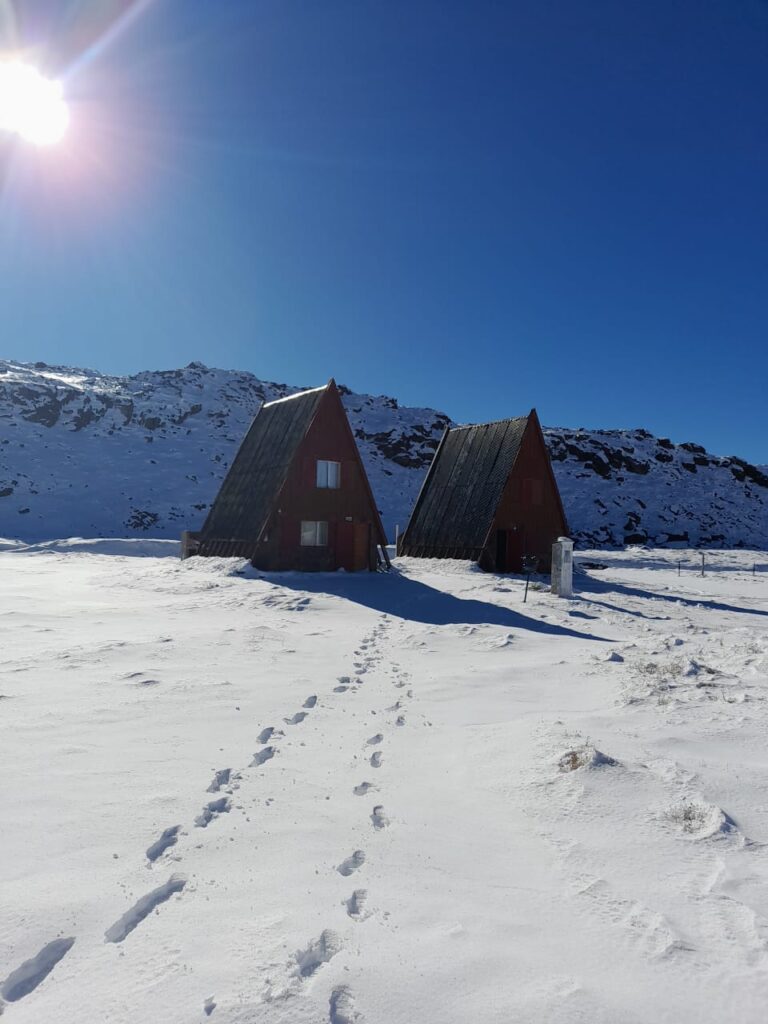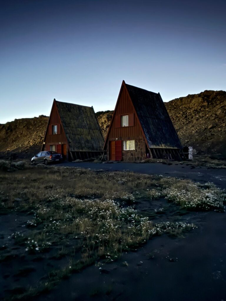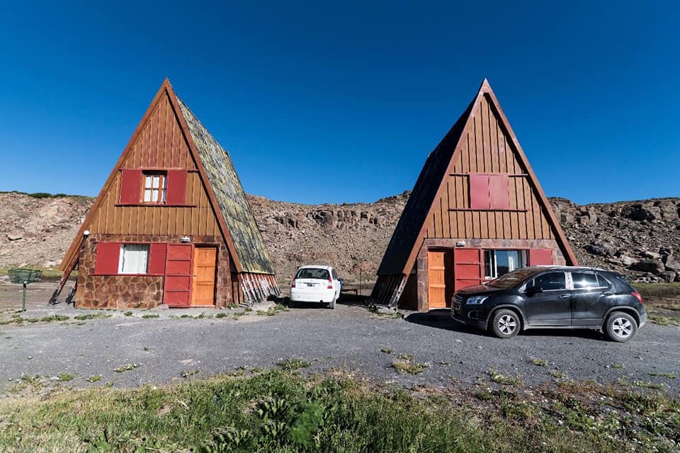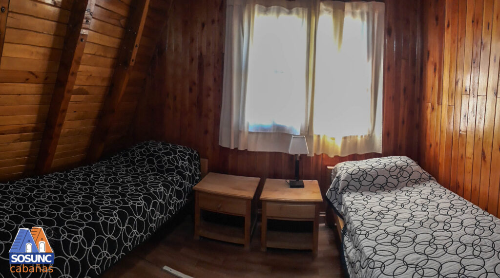 En la planta alta, cada cabaña tiene una habitación con cama matrimonial y otra con dos camas de una plaza. En la planta inferior, hay un sillón-cama, cocina y baño.