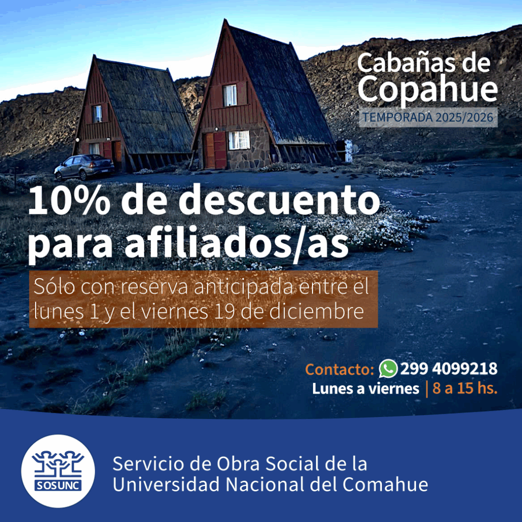 Las reservas se administran únicamente a través del área de Turismo de SOSUNC. Hay que enviar un mensaje a la línea de Whatsapp 299 4099218 de lunes a viernes, en horario de 8 a 15.