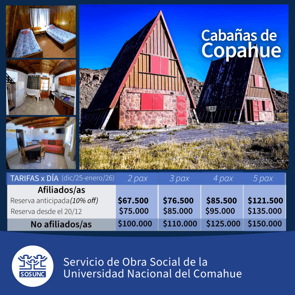 En la villa termal Copahue, SOSUNC cuenta con dos cabañas del tipo alpina sobre la calle Herrero Ducloux, a dos cuadras del Complejo de Balneoterapia. Cada una tiene capacidad para cinco pasajeros.